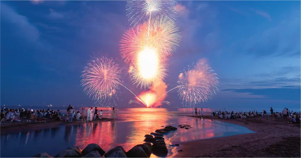 水中花火や打ち上げ花火など約2,500発が夜空と海を染め上げる夏の風物詩「鎌倉花火大会」。1948年(昭和23年)より長年に渡って愛されてきた、この大会の打ち上げ会場目前というロケーションで、鮮やかな花火を大迫力で眺められる特等席です。