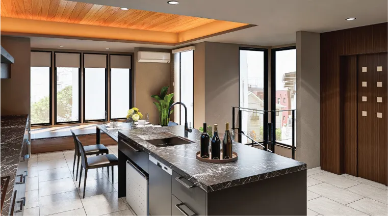 - 8LDKの中心に設けたアイランドキッチンは、お料理しながらご家族とも会話できて便利。
