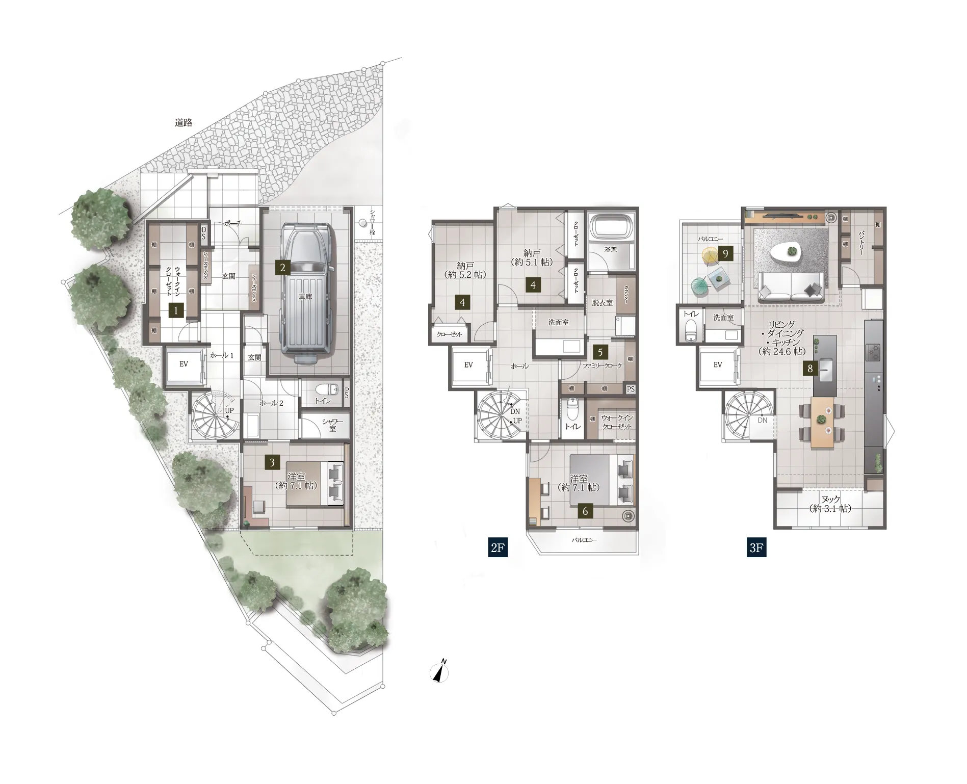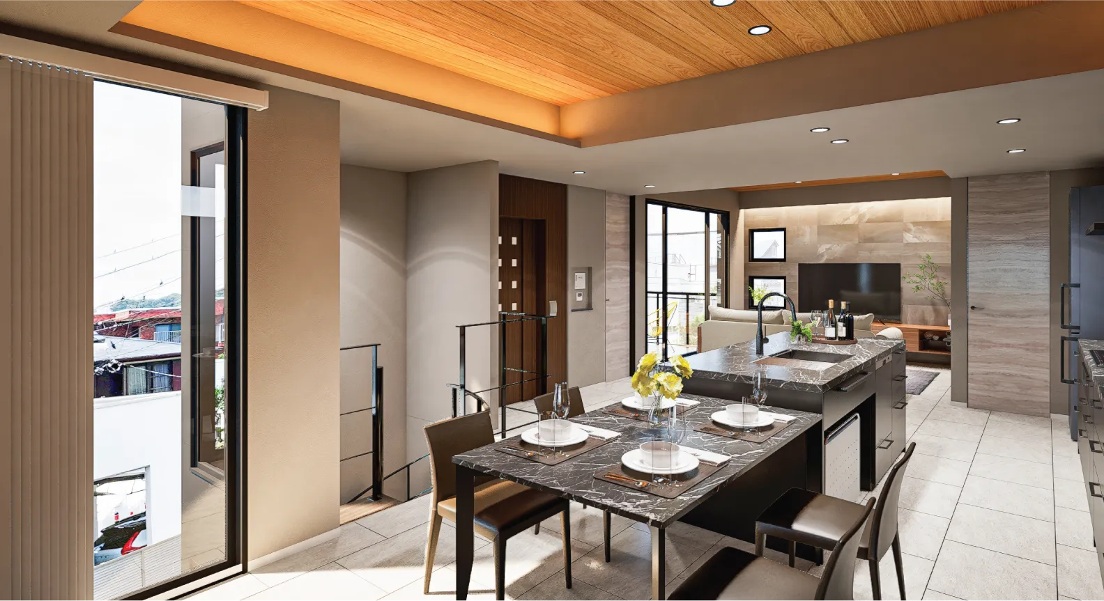 ※掲載のリビング・ダイニング、ビルトインガレージ、居室の完成予想CGは計画段階の図面を基に描き起こしたもので実際とは異なる場合があります。 家具・照明・調度品等は販売価格に含まれておりません。実際と質感・色等の見え方が異なる場合があります。 設備・仕様等については各号棟により異なります。また、現地3階相当から撮影(2025年7月)した眺望写真を合成・加工したもので実際の住戸からの眺望とは異なります。 眺望・周辺環境は今後変わる可能性があり将来に渡って保証されるものではありません。