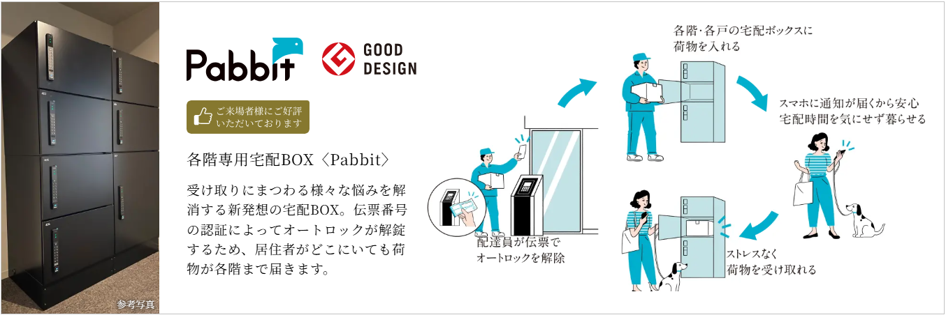 まず、昨今の宅配ニーズの高まりを鑑みて、各階に宅配ボックスを設置いたしました。