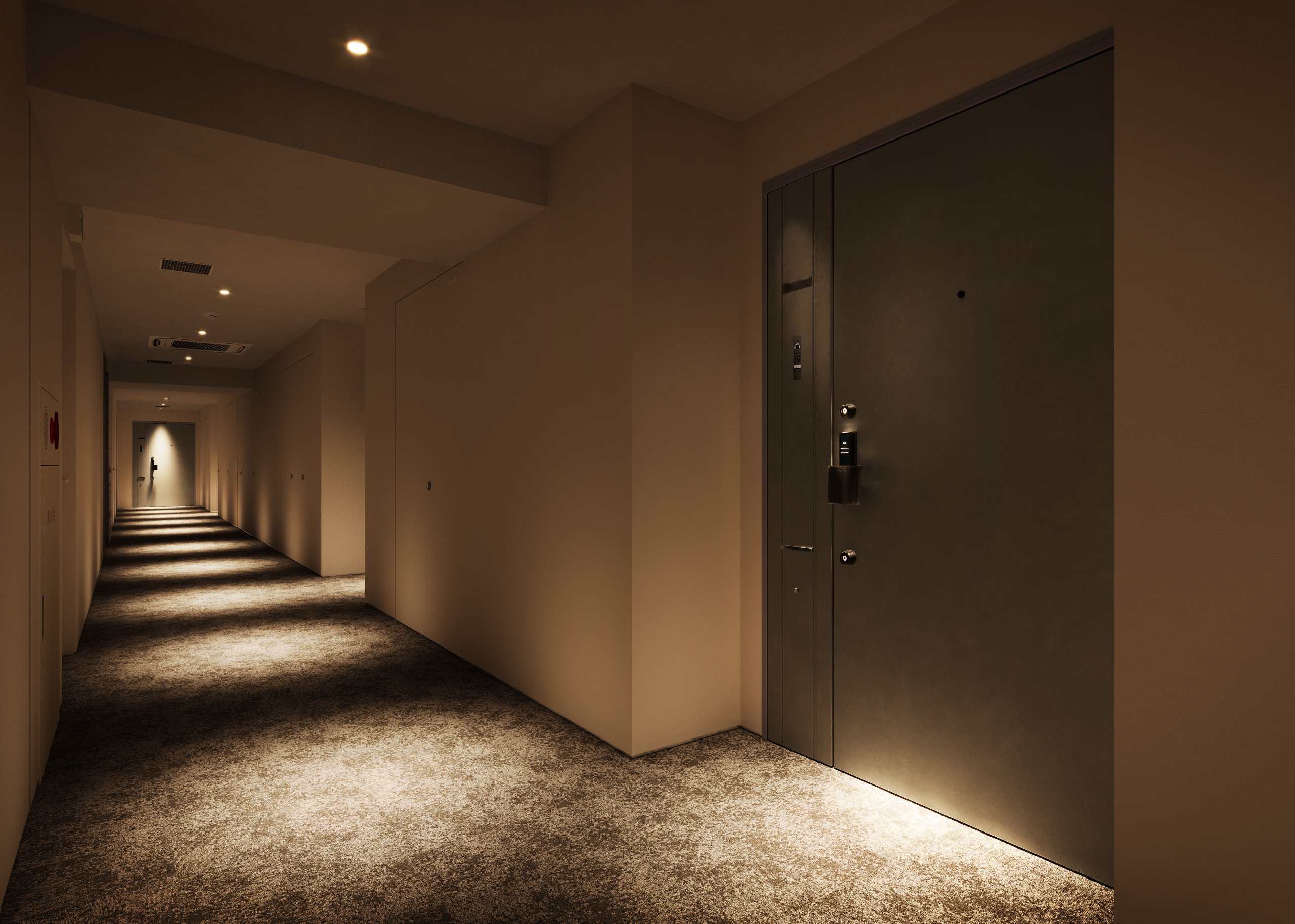 たとえば、住宅階の共用廊下には絨毯を敷き、ほのかな明かりでホテルライクな雰囲気を演出しています。