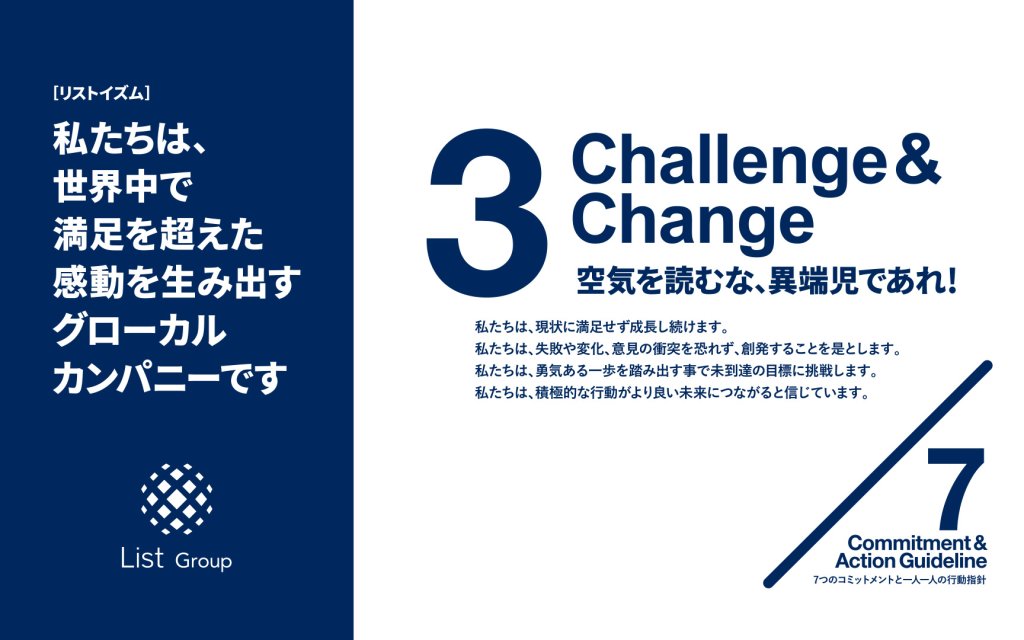 『CHALLENGE&CHANGE』の「私たちは、勇気ある一歩を踏み出す事で未到達の目標に挑戦します。」という言葉は好きですね。