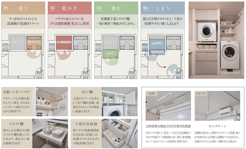 洗う、乾かす、畳む、しまう、が一つの空間で完結する点ですね。大幅な時短になるので、共働きで仕事終わりに家事をこなす家庭にとっては嬉しいものとなったと思います。